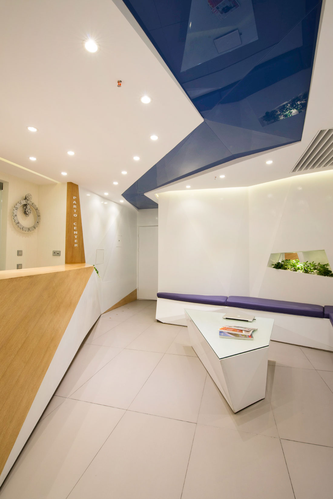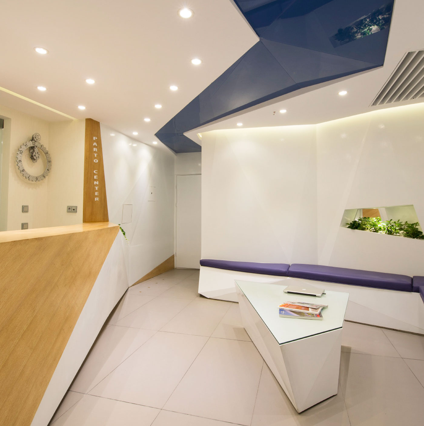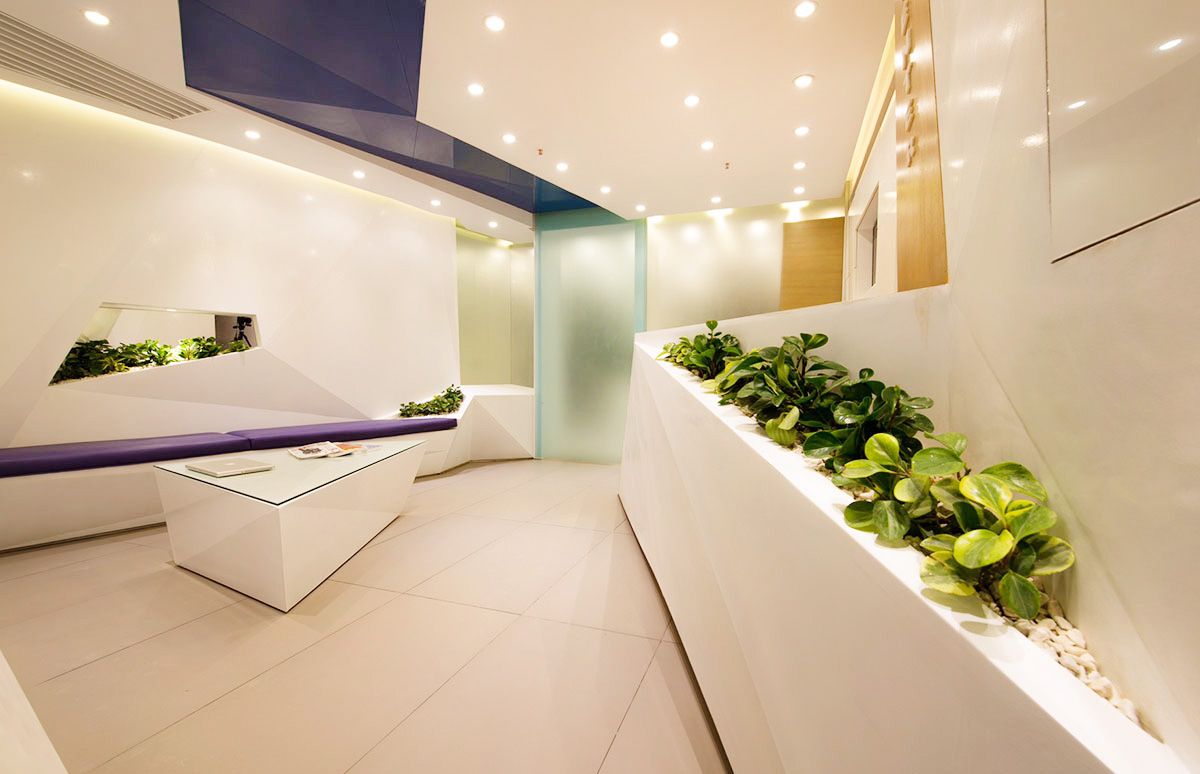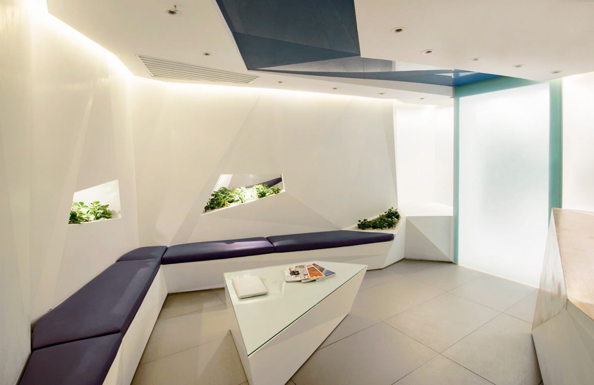 همواره فضای مطب دندانپزشکی به لحاظ احساس درد و آزردگی ناشی از دستگاه های پر سروصدا، فضایی نامطلوب به شمار آمده است. با درنظرگفتن این مهم، فضایی که احساس آرامش و پاکیزگی را در ذهن مراجعان ایجاد سازد، از نخستین اولویت های طراحی این پروژه بوده¬است. در این مکان، ضمن تاکید کارفرما، هدف به واسطه فضاسازی محیط شکل گرفته است. بدین منظور فرایند شکل¬یابی فضا با حذف دیوارهای موجود و شکل بخشیدن به آنها با برهم زدن هندسه منظم و تبدیل آن به هندسه ای پویا و غیریکنواخت آغاز شد. هندسه طرح با بهره¬گیری از الگویی خاص برای شکل دهی به اجزاء، با استفاده از خطوط شکسته در طراحی سقف، فضای لابی، قفسه ها، نیمکت¬ها و سایر اجزای جنبی، سبب شده تا این اجزاء با ترکیبی هماهنگ با هندسه حاکم بر فضا، با جداره ها ادغام گردند، به¬طوری¬که بنایی همگون و یکدست را به ارمغان آورده¬اند. این قابلیت در فضا تاثیری متفاوت بر مخاطب داشته و مسیر هدایت از یک فضا به فضای دیگر را ضمن تقسیم بهینه آنها ایجاد کرده است. علاوه بر این، شکستگی خطوط، در میان رنگ سپید جداره ها، رنگ خودرنگ چوب و خاکستری خنثی در سطوح افقی، پنهان شده اند تا ادراکی مطلوب را از حس فضا را به کاربران ارزانی بخشند.
