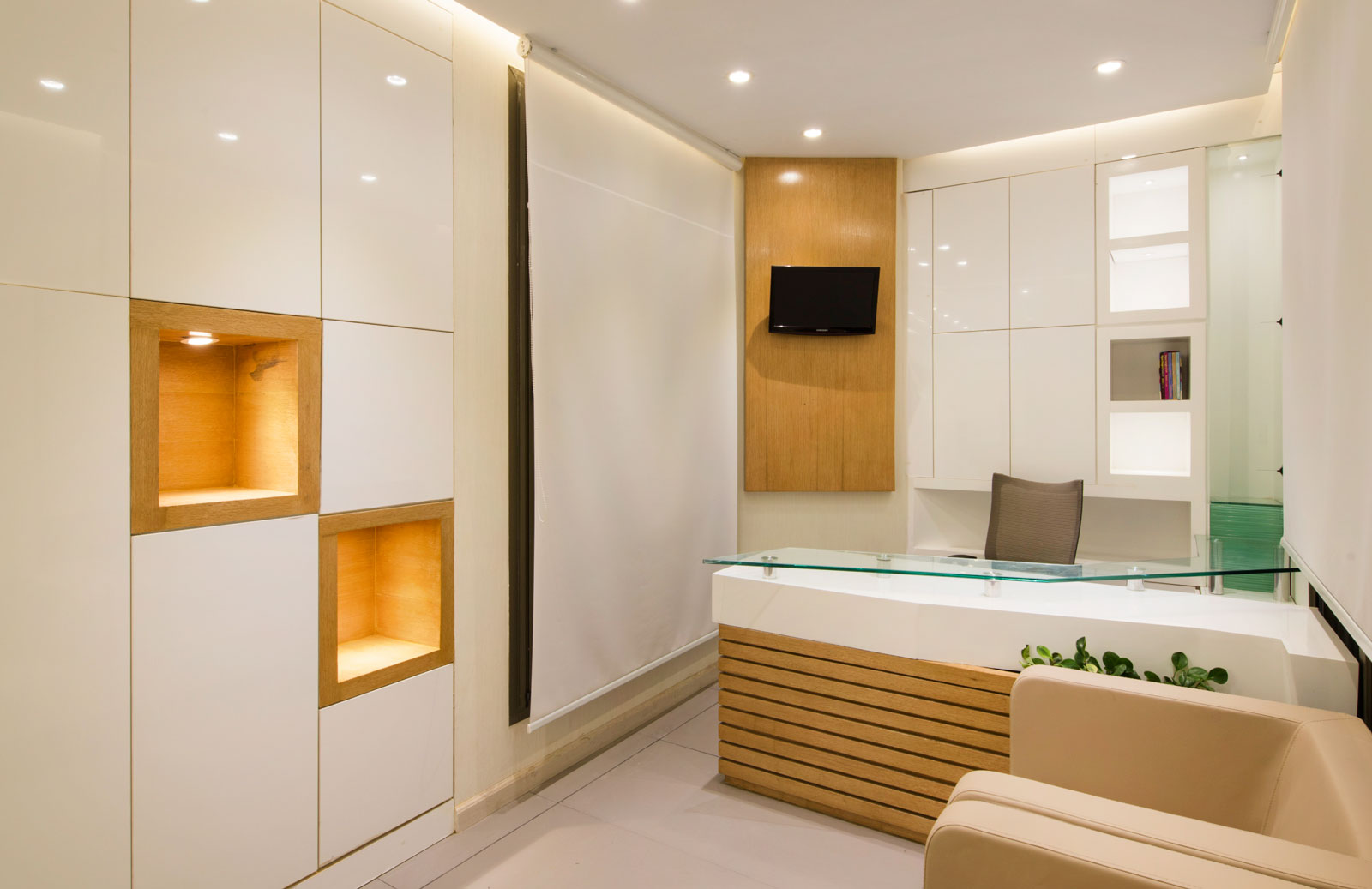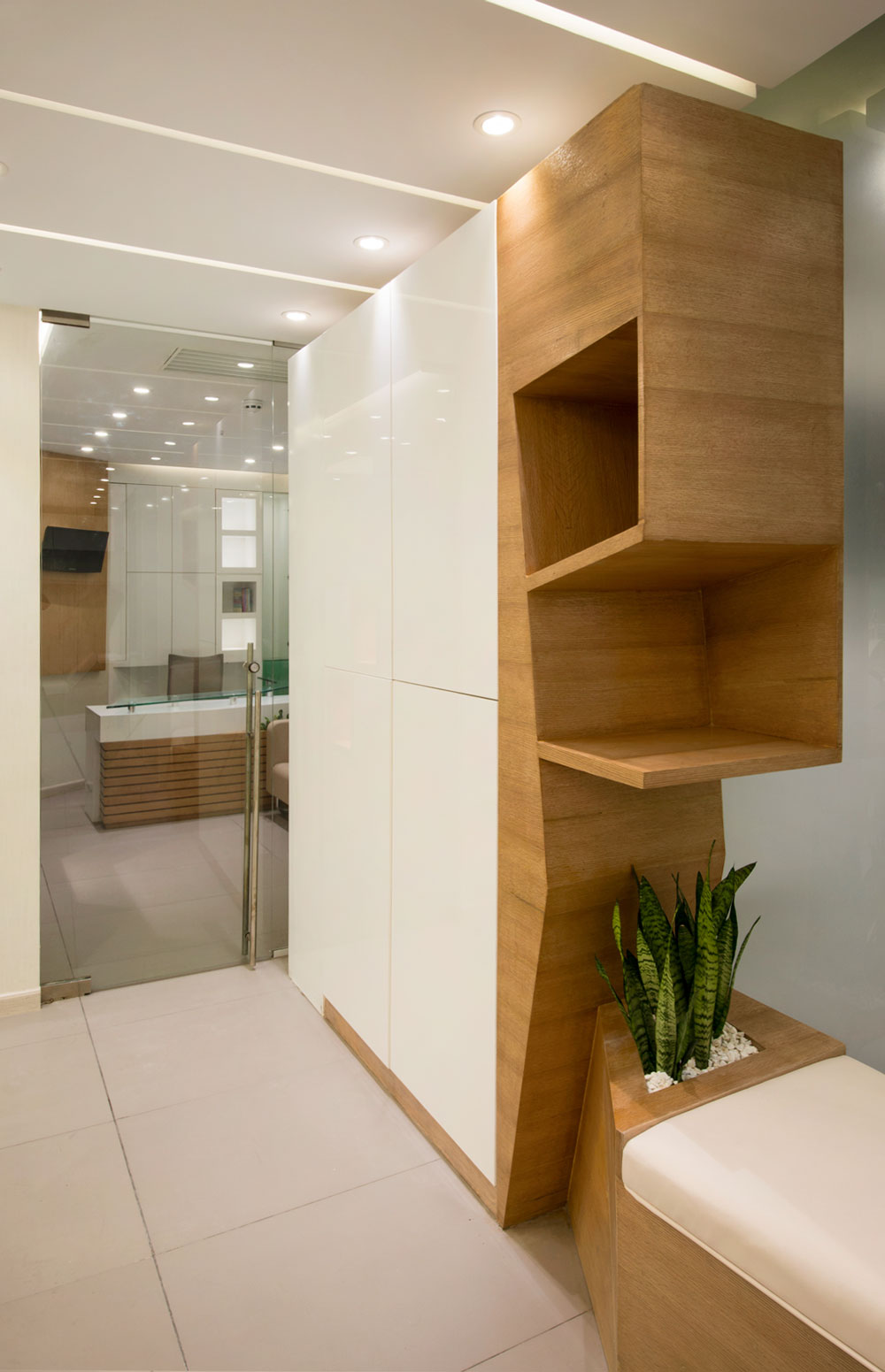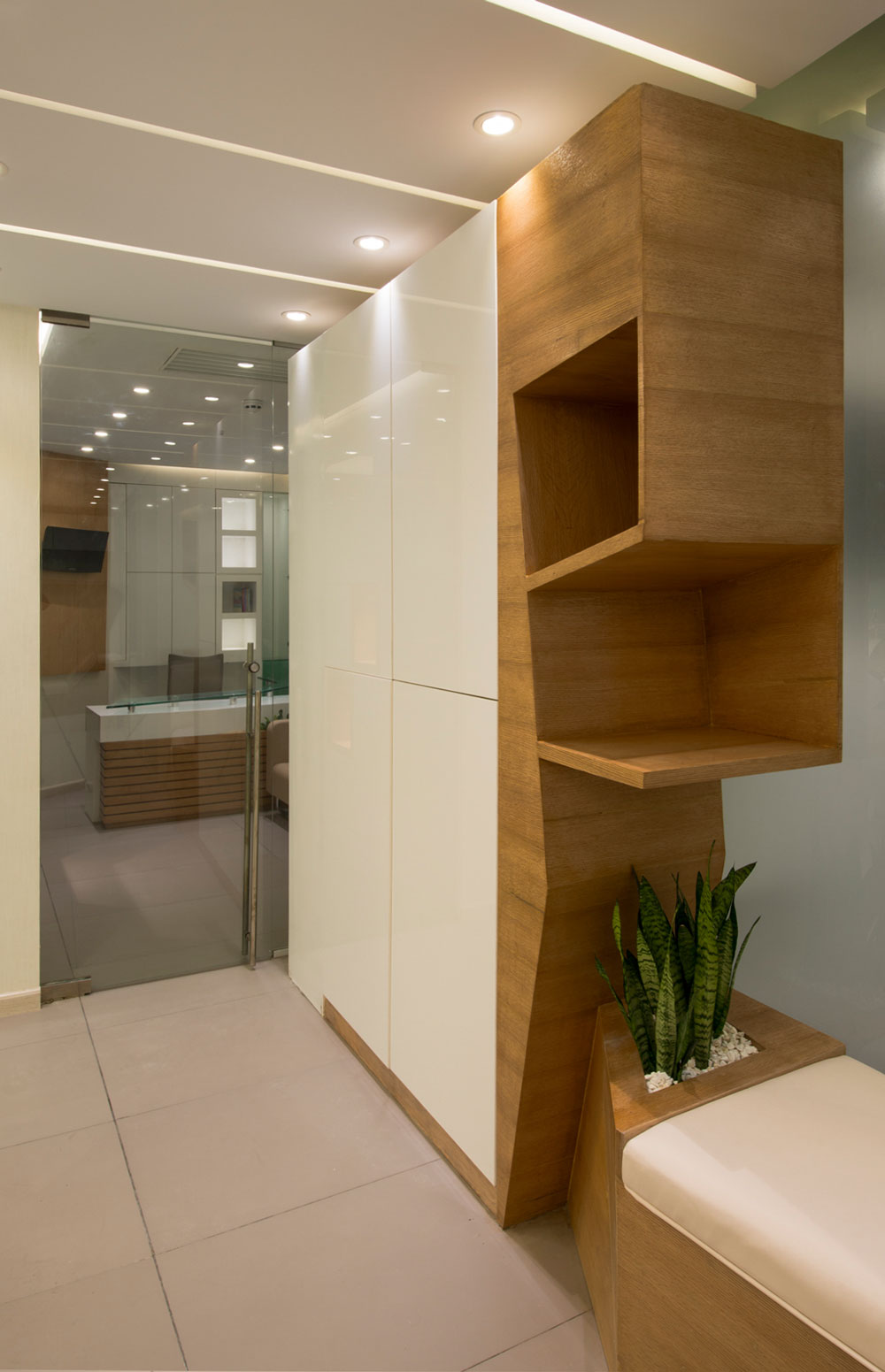 همواره فضای مطب دندانپزشکی به لحاظ احساس درد و آزردگی ناشی از دستگاه های پر سروصدا، فضایی نامطلوب به شمار آمده است. با درنظرگفتن این مهم، فضایی که احساس آرامش و پاکیزگی را در ذهن مراجعان ایجاد سازد، از نخستین اولویت های طراحی این پروژه بوده¬است. در این مکان، ضمن تاکید کارفرما، هدف به واسطه فضاسازی محیط شکل گرفته است. بدین منظور فرایند شکل¬یابی فضا با حذف دیوارهای موجود و شکل بخشیدن به آنها با برهم زدن هندسه منظم و تبدیل آن به هندسه ای پویا و غیریکنواخت آغاز شد. هندسه طرح با بهره¬گیری از الگویی خاص برای شکل دهی به اجزاء، با استفاده از خطوط شکسته در طراحی سقف، فضای لابی، قفسه ها، نیمکت¬ها و سایر اجزای جنبی، سبب شده تا این اجزاء با ترکیبی هماهنگ با هندسه حاکم بر فضا، با جداره ها ادغام گردند، به¬طوری¬که بنایی همگون و یکدست را به ارمغان آورده¬اند. این قابلیت در فضا تاثیری متفاوت بر مخاطب داشته و مسیر هدایت از یک فضا به فضای دیگر را ضمن تقسیم بهینه آنها ایجاد کرده است. علاوه بر این، شکستگی خطوط، در میان رنگ سپید جداره ها، رنگ خودرنگ چوب و خاکستری خنثی در سطوح افقی، پنهان شده اند تا ادراکی مطلوب را از حس فضا را به کاربران ارزانی بخشند.